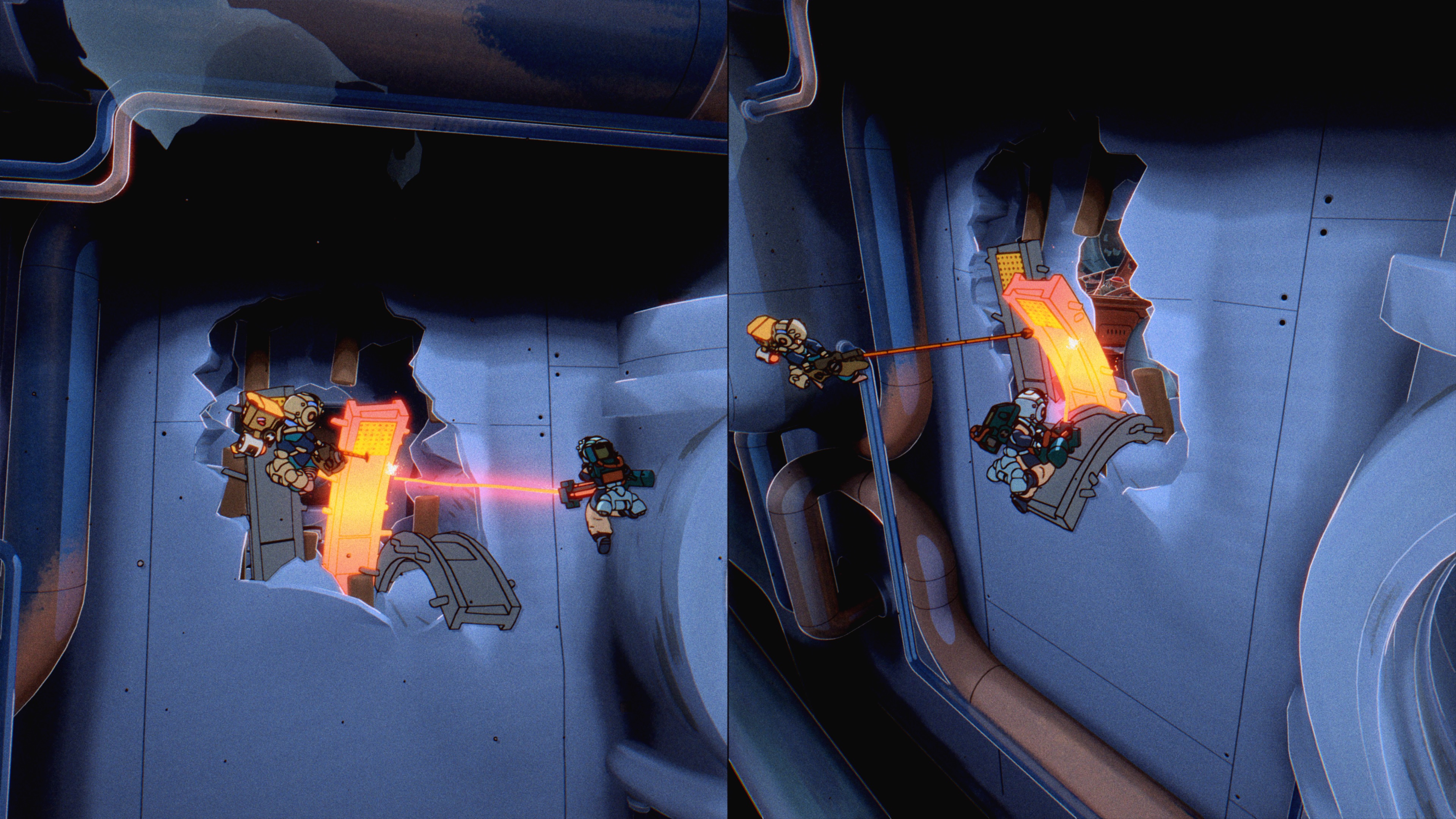 특히 한 플레이어가 '빔 캐논'으로 장애물을 녹이면 다른 플레이어가 '스크랩 훅'으로 길을 만드는 등 전략적인 협동 플레이가 요구된다. 스토리 모드 외에도 친구와 경쟁할 수 있는 아케이드 미니게임도 제공한다.