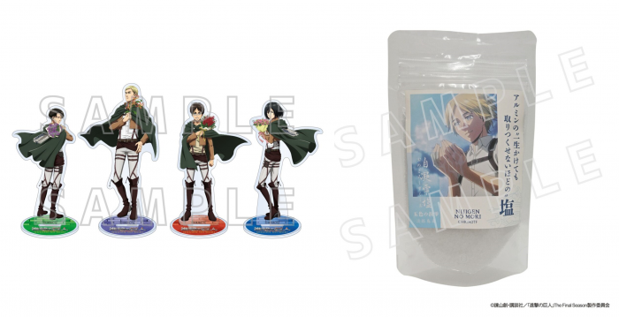 먼저 오리지널 신규 일러스트가 된 에렌과 미카사, 리바이, 엘빈이 캔 배지와 아크릴 스탠드가 되어 등장한다. 또한 오리지널 일러스트의 거인들도 손수건과 아크릴 키홀더, 에코백 등으로 등장한다. 그 외에 ‘리바이 병장의 명대사 메모’나 ‘아르민의 ‘평생을 다 바쳐도 담을 수 없을 정도의’ 소금’ 등 진격의 거인 팬이라면 놓칠 수 없는 소소한 요소를 담은 오리지널 굿즈 총 36종을 판매한다.
